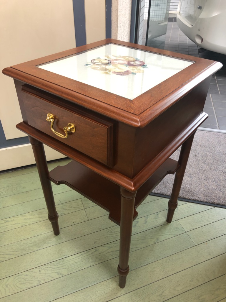 桜材の無垢を使い天板にお客様が趣味でお作りになられている刺繍のプレートをはめ込みガラス板をその上から入れております。